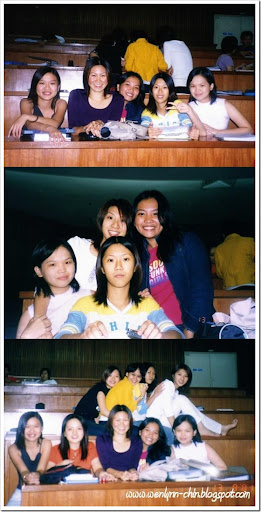 They are the friends I've made during my first year of college. First row from left is Sei Sei, Denise, Siew Ai, myself and Jenny. Second row is Pauline, Putrie, Leng Boi and Ying Yan. (Photo taken 13th August 2001 - Lecture Theatre B IICP)