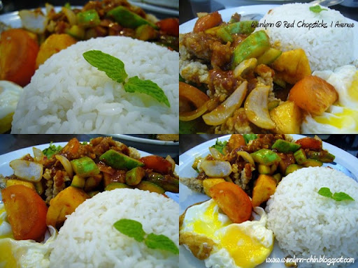 Urm.. this is chicken Spicy Sweet & Sour rice.. with egg... looks not much difference from the fish one I know.. haha.. got got.. the mint leaves are different in size.. and it has one egg there.. :P