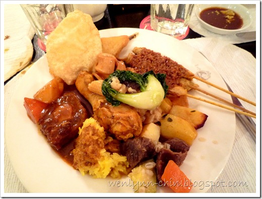 more on local fares… nasi kunyit (glutinous turmeric rice) with chicken curry, beef/oxtail stew, papadoms, satays, mixed vege and mushrooms….